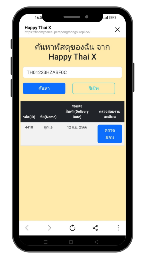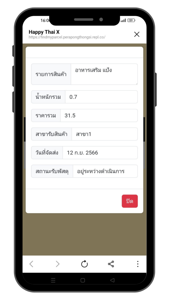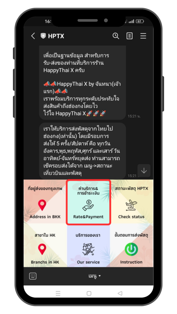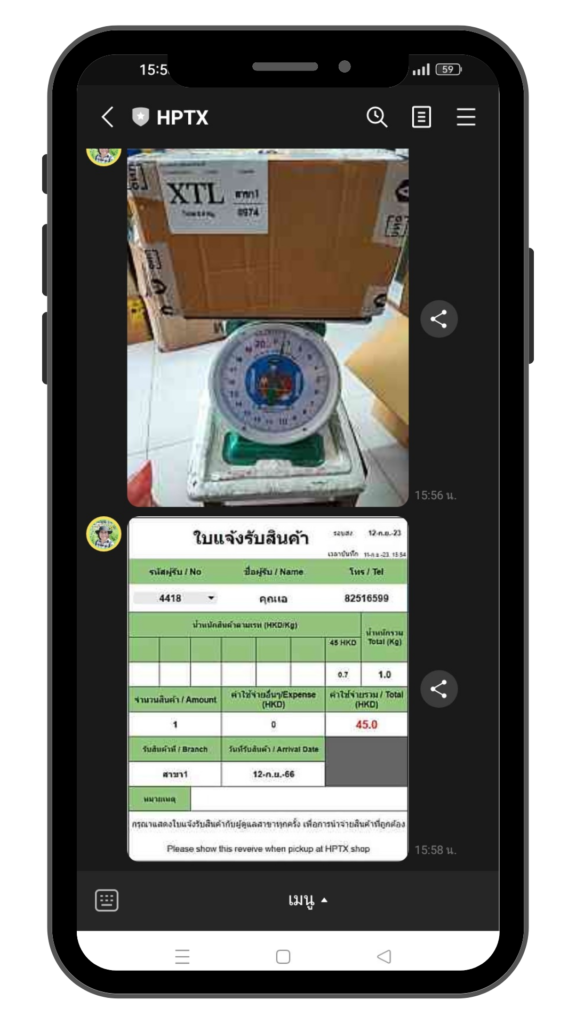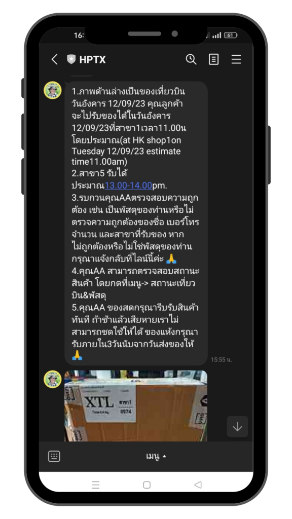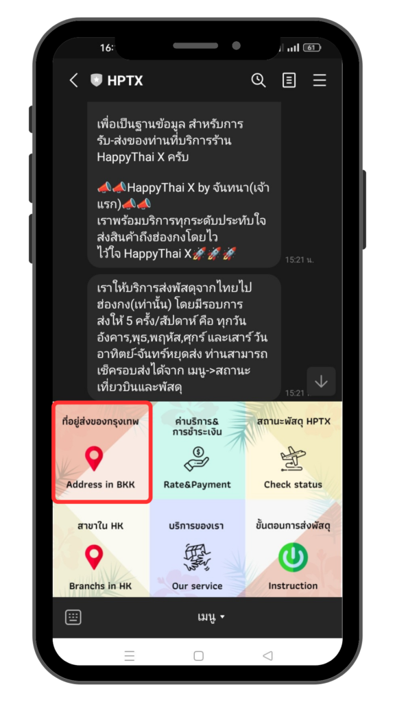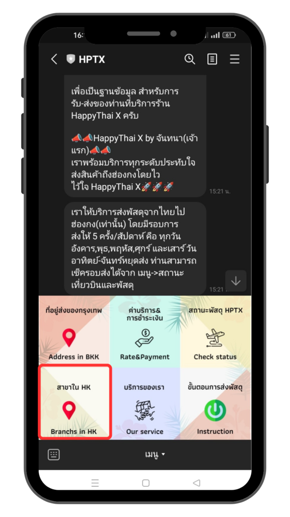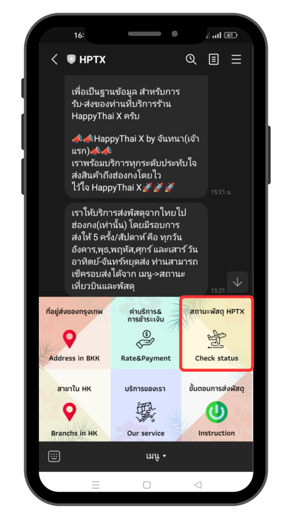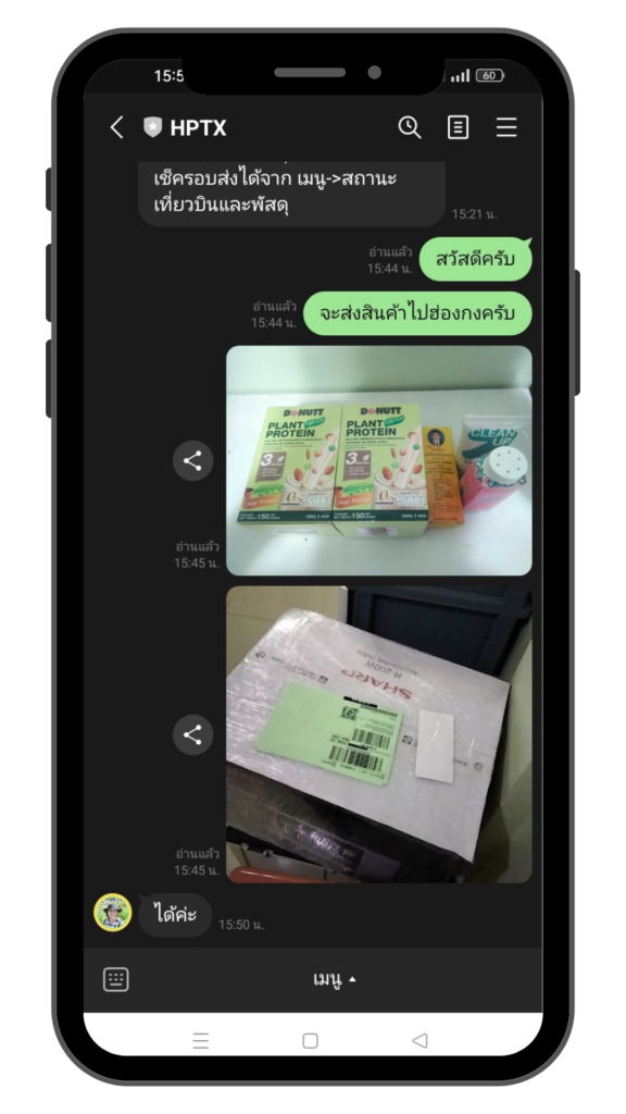 ขั้นตอนการส่งพัสดุ / Uncategorized / By admin_happythaix เพิ่มเพื่อน โดยแอดไลน์ @happythaix Add friend via Line application, search @happythaix ส่งพัสดุของท่านมาที่ สนง-กรุงเทพฯ โดยสามารถดูที่อยู่จัดส่งได้ที่ “ที่อยู่ส่งของกรุงเทพ” Deliver your parcel to BKK store, see “Address in BKK” ดูอัตราค่าบริการของประเภทสินค้าได้ที่ “ค่าบริการ&การชำระเงิน” Check service rate, see “Rate & Payment” เลือกดูสาขาให้บริการในฮ่องกง ที่เมนู "สาขาใน HK" Check your convenient place to pick-up at HK, see “Branch in HK” ส่งภาพ ข้อมูลรูปสินค้ามาทางไลน์ It would be better if you can send us your parcel’s photos. เมื่อถึงกำหนดรอบส่ง เราจะแจ้งรอบส่งให้ทางไลน์ Then we will inform you delivery date, branch, time(approx) to pick-up your parcel ใบแจ้งรับสินค้า จะถูกส่งให้ทางไลน์ ในวันที่สินค้าจะไปถึง Receive notification bill will be sent to you at that delivery date, show this bill when you pick-up at HTPX shop หากต้องการตรวจเช็คพัสดุ นำเลขพัสดุมาตรวจเช็คได้ที่ “สถานะพัสดุ” You can check parcel status via manu “Check status” กรณีลูกค้าต้องการตรวจสอบสถานะ สามารถกรอกเลขพัสดุ(Kerry, Flash, Thaipost etc) ได้ที่ช่อง แล้วกด “ค้นหา” As well as you can check from original parcel number (e.g. Shoppee, Lazada, Thaipost, etc) กด “ตรวจสอบ” Press “ตรวจสอบ” (Check) จะแสดงผลการค้นหา กรณีแจ้งว่า “อยู่ระหว่างการดำเนินการ” หมายความว่า ทางเราได้รับพัสดุจาก บ.ขนส่งในไทยแล้ว และอยู่ระหว่างส่งต่อไปฮ่องกง Your parcel details will shown.
